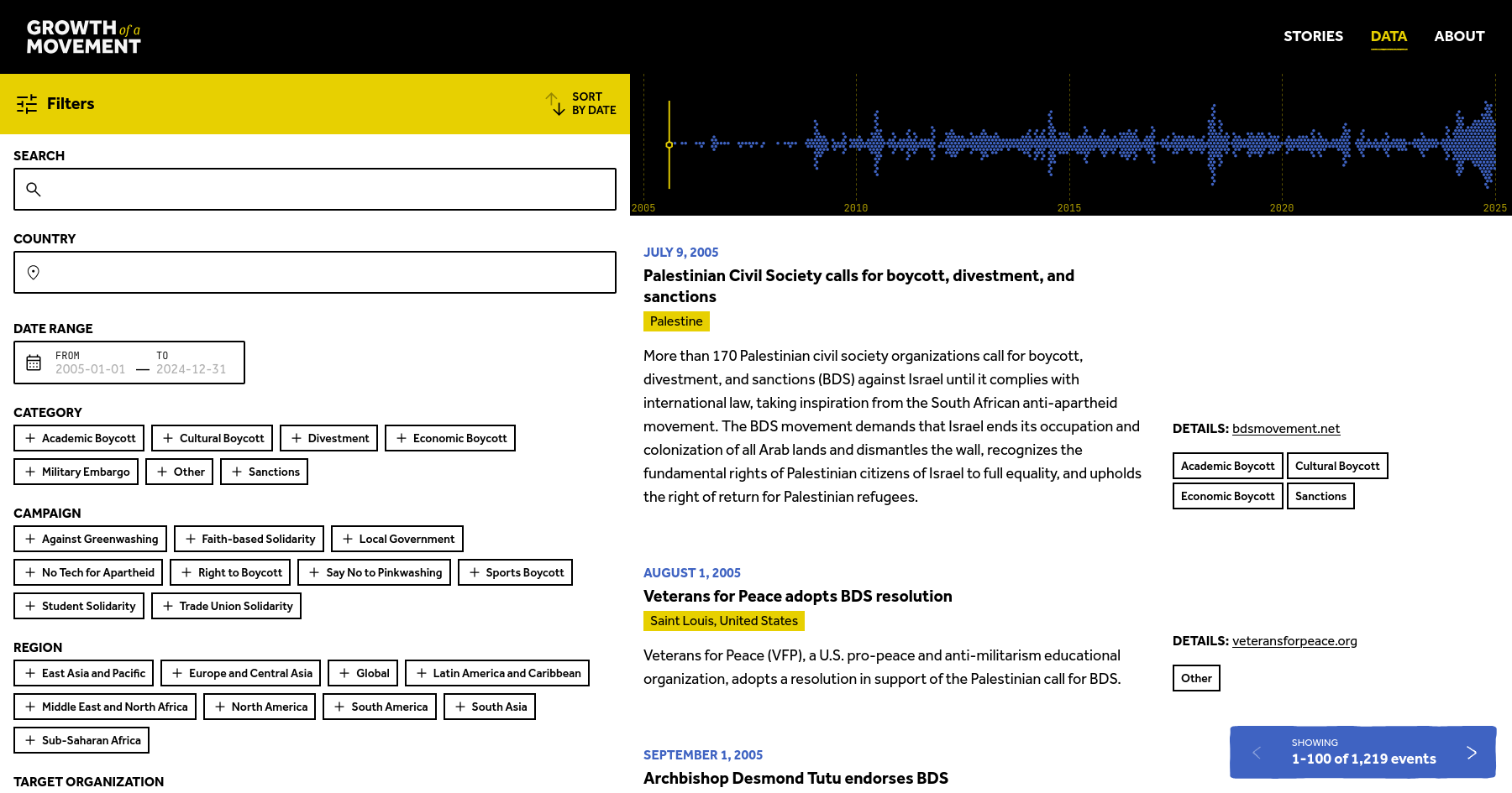 Visualizing Palestine's artists provided striking illustrations and a design style that emphasized the diverse, collective, grassroots movement. I used these to build an interactive story mode, which highlights key moments of campaigns and movement successes.